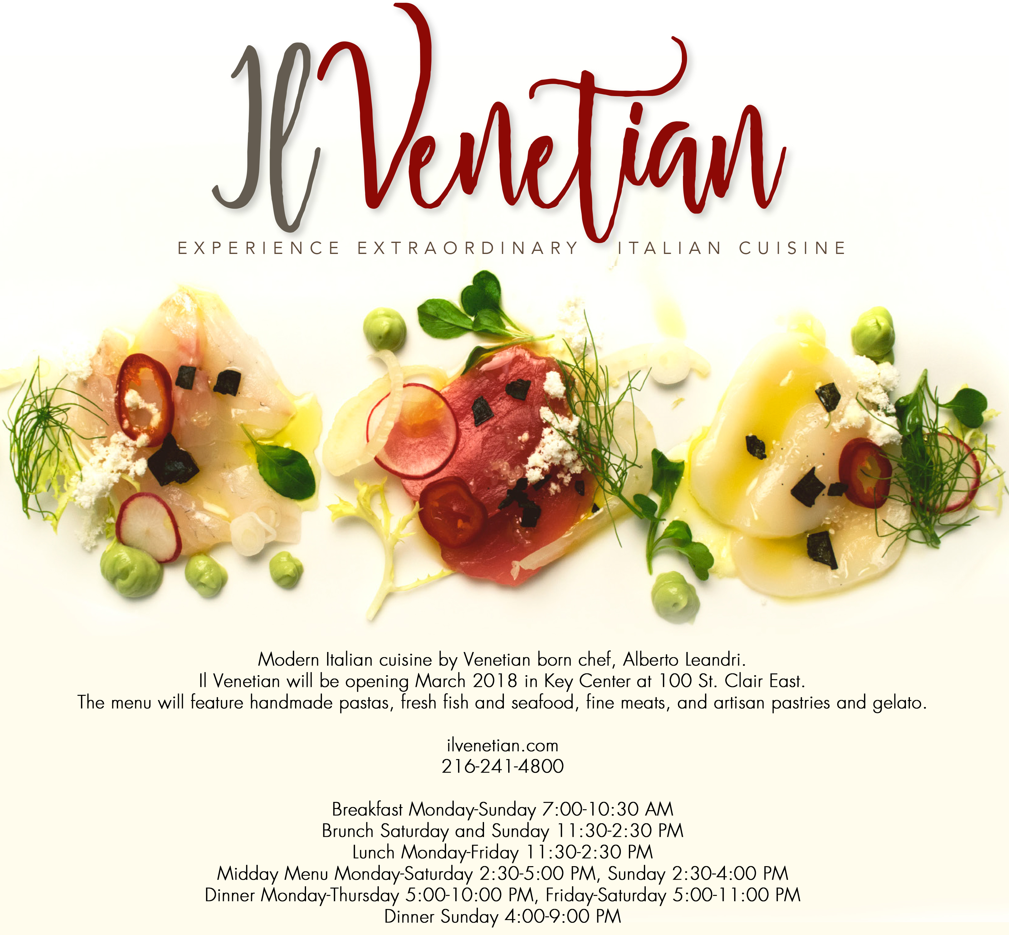 Modern Italian cuisine by Venetian born chef, Alberto Leandri. Il Venetian will be opening March 2018 in Key Center at 100 St. Clair East.